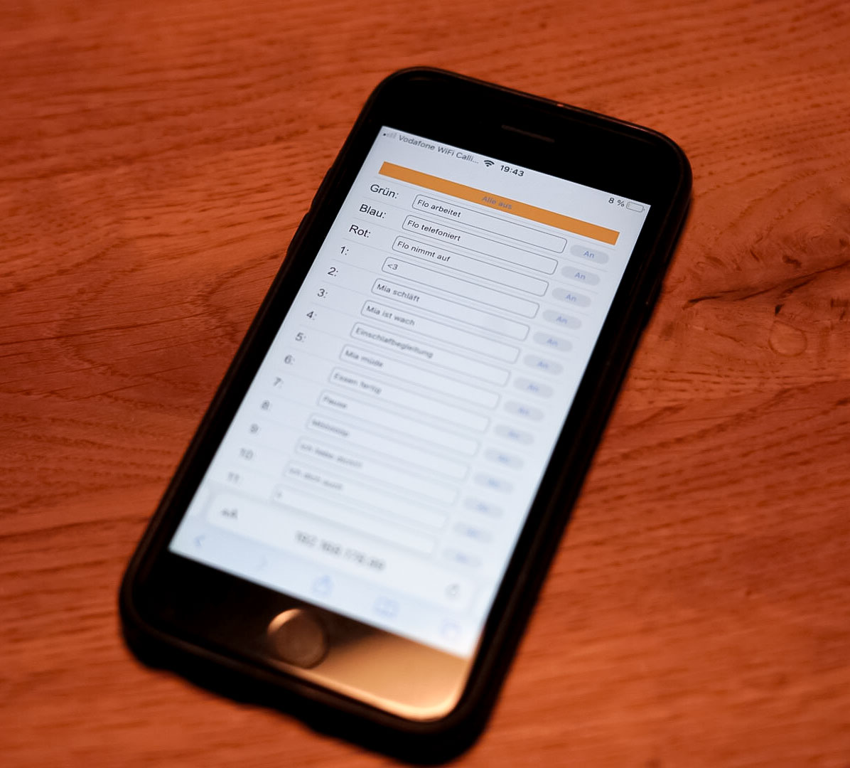 Über den Browser kann man die IP-Adresse des Server-Moduls aufrufen, um das Leucht-Setup zu konfigurieren und zu steuern. Das Client-Modul synchronisiert seinen Status mit dem Server-Modul. Eine getestete Option mit einem zusätzlichen Drucktaster führte zu Problemen und wurde aus zeitlichen Gründen verworfen.